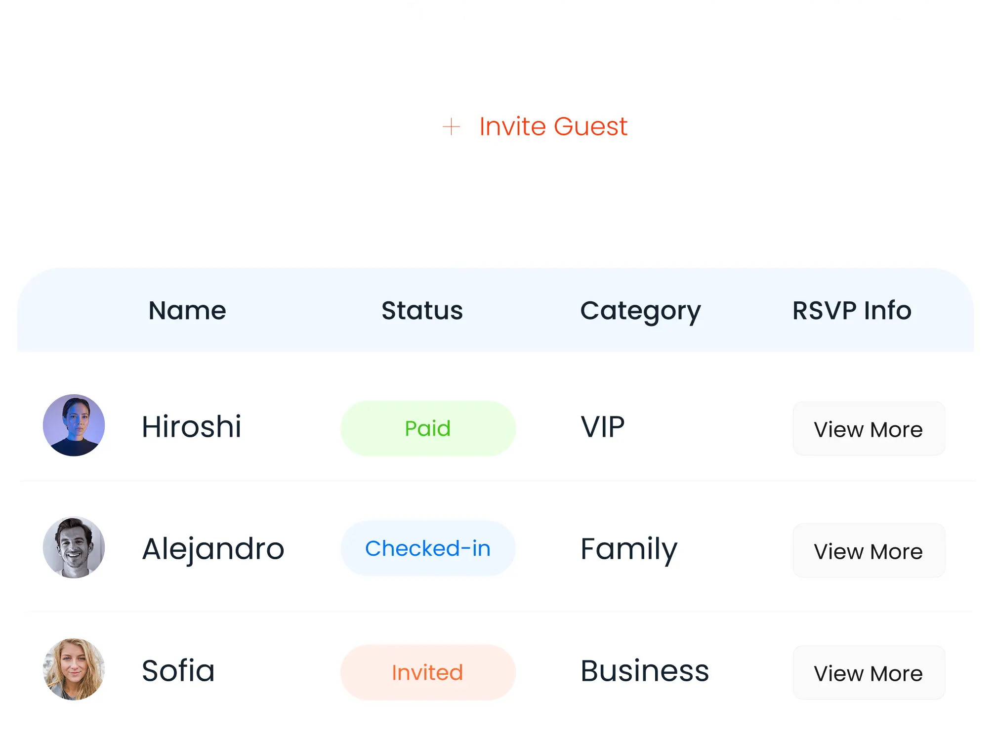 Share branded RSVP pages, track responses in real time, and tag guests instantly. Manage VIPs, staff, and categories effortlessly from one unified event management system.
