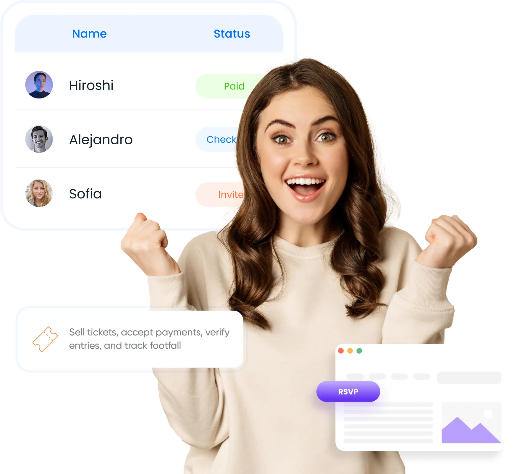 Control RSVPs, registrations, ticket sales, guest tagging, and on-site check-ins from one intuitive dashboard. Track everything in real time, validate entries instantly, and manage your full RSVP event management workflow with total clarity.